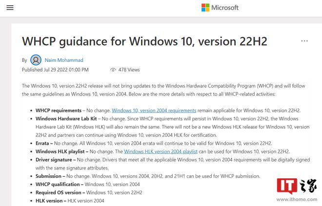 IT之家了解到,微软 Windows 10 22H2 即将面向所有用户推送,与此同时,微软在一篇用于帮助商业客户和公司部署 Windows 10 的博客文章明确指出,22H2 版的 Windows 硬件兼容性计划 (WHCP) 没有变化,甚至与2004 版本完全相同。所以大家也不用担心会在新版本中被限制。