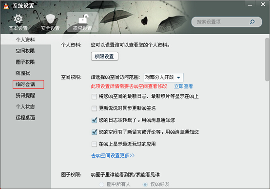 一、在QQ设置面板里面开启临时回话功能